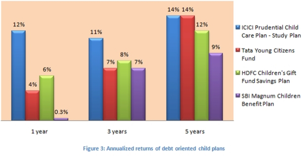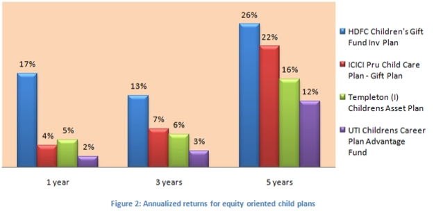 The chart below shows annualized returns for equity oriented child plans over a one, three and five year time periods (based on Feb 20 NAVs)