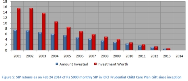 The chart below shows returns as on Feb 24 2014 (NAVof 58.7) of Rs 5000 monthly SIP in HDFC Children’s Fund - Investment Plan, for respective years since inception (in Mar 2001). The SIP date has been assumed to first working day of the month. The amounts are shown in Rs lakhs.