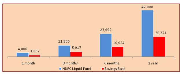 The chart below shows the pre tax returns of Rs 5 lakhs investment in a liquid fund (e.g. HDFC Liquid Fund) and savings bank (with average daily balance of Rs 5 lakhs) over 1 month, 3 months, 6 months and 1 year.