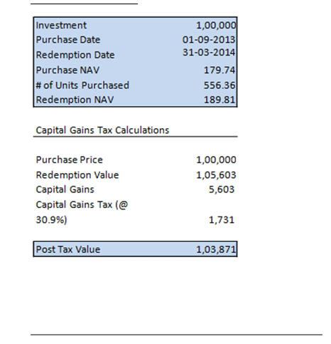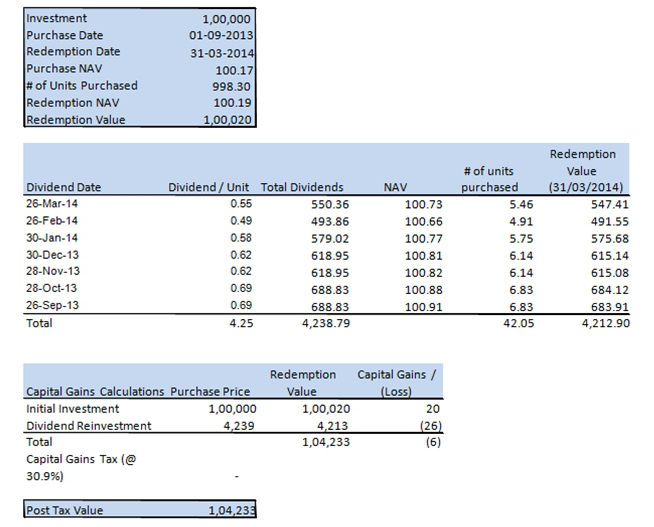 Let us assume you are an investor in the highest tax bracket. You have invested Rs 1 lakh of your surplus cash in ICICI Prudential Liquid fund on Sep 1, 2013. You redeemed your units on Mar 31, 2014. You had two options in which to invest your funds.